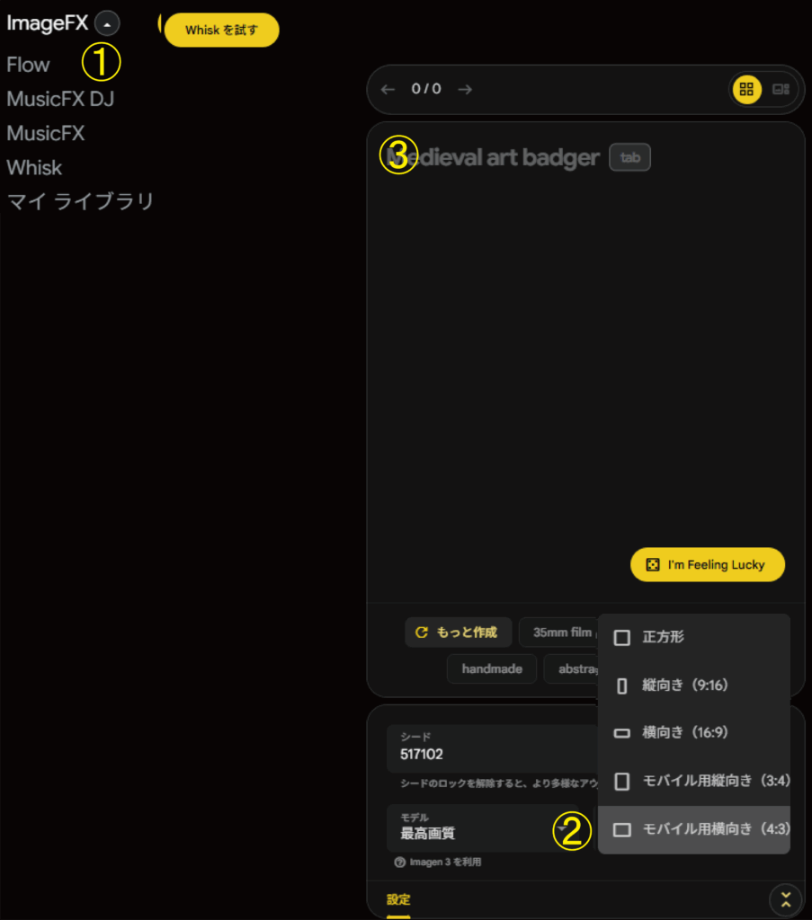 ①生成AIで何を生成するかを設定します。画像を作成するのでimageFXを選択します。マイライブラリには生成した画像が保存されています。